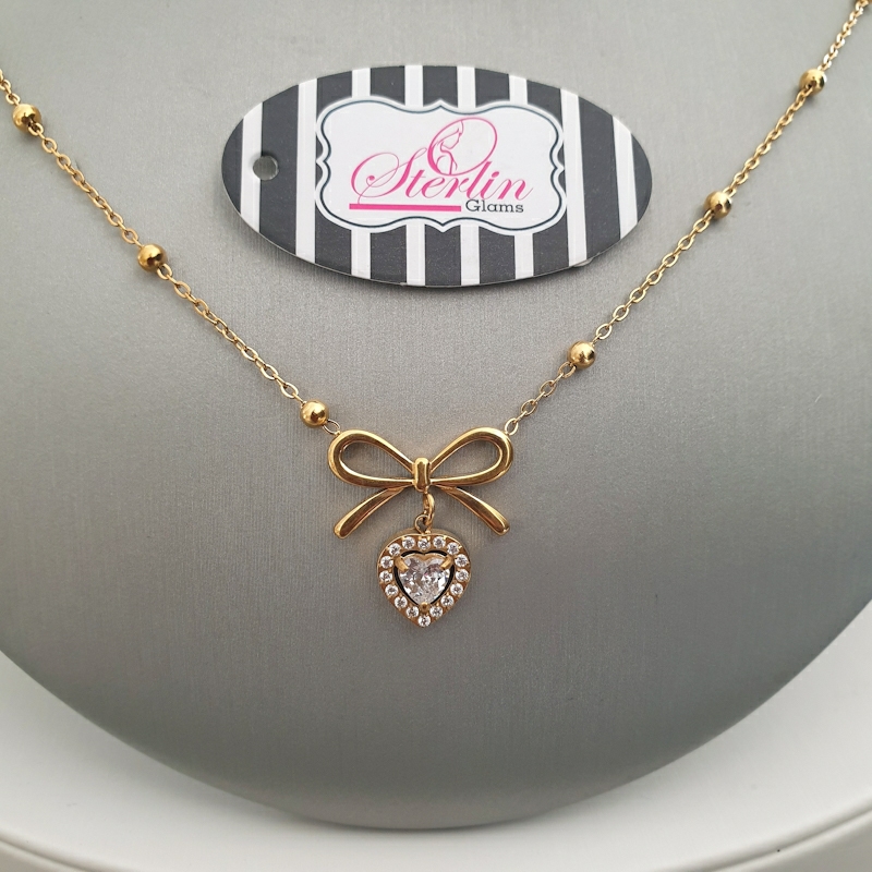 for added style. A crystal heart drop pendant sits beneath the bow, framed with
