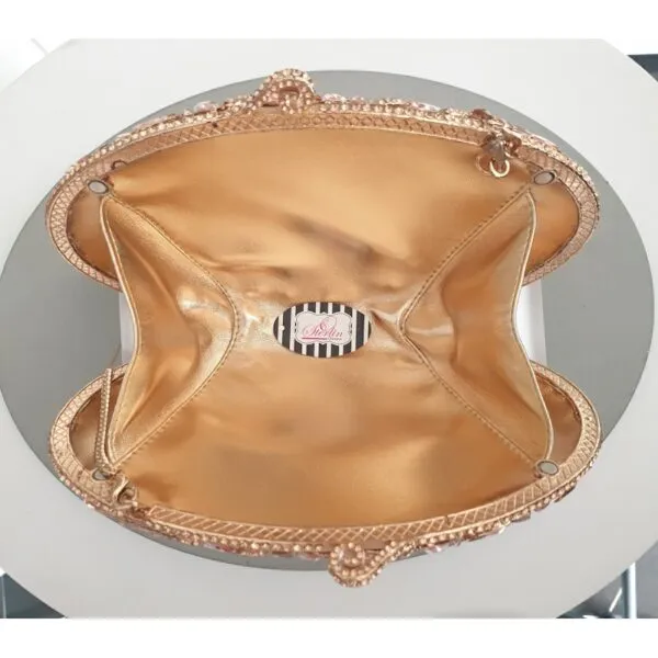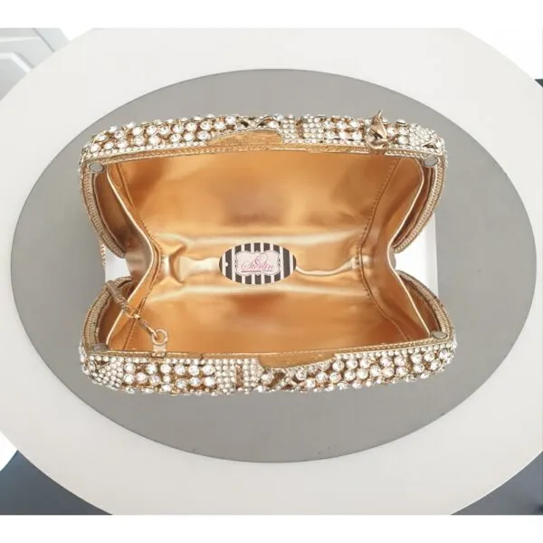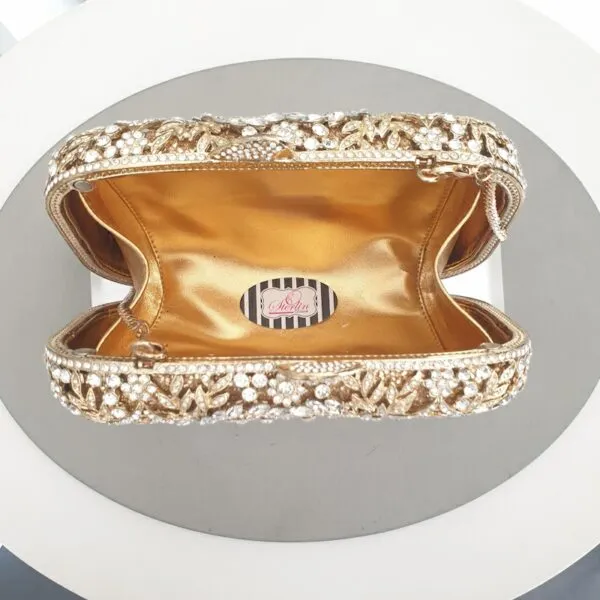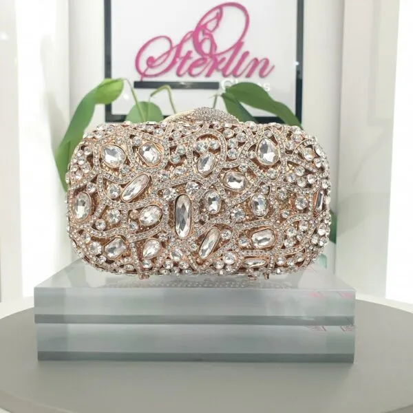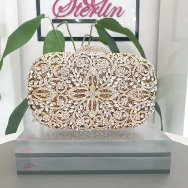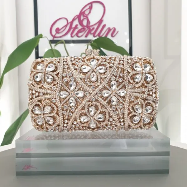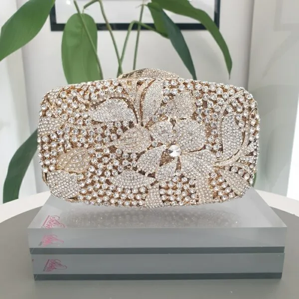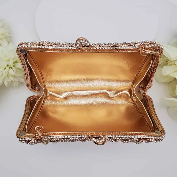 A glamorous gold crystal box clutch designed with an elegant rose-inspired crystal pattern.