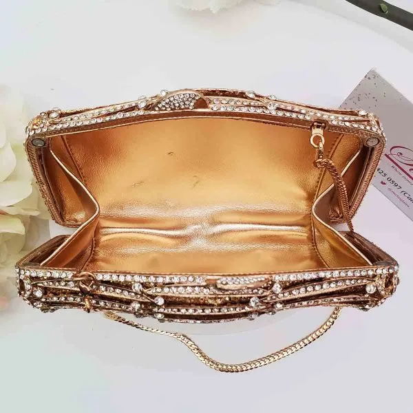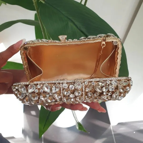 The Gold Crystal Rose Clutch is a stunning statement piece inspired by timeless romance and refined glamour.