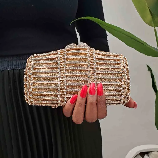 Bold yet feminine, the Gold Crystal Rose Clutch delivers a luxurious