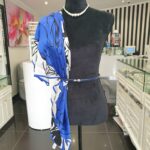 A 100% silk scarf in elegant blue and black tones with a smooth, lightweight drape.