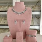 The set features a beautifully detailed necklace paired with matching earrings, a bold ring, and a delicately designed bracelet, all adorned with high-sparkle stones that shimmer with every movement.